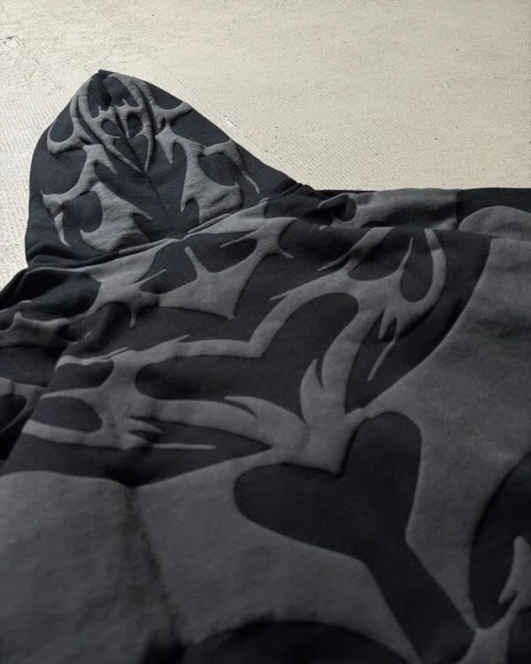 This oversized hoodie features a bold abstract gothic pattern in black and dark grey, giving it a unique streetwear edge. At the center, it showcases an embroidered white gothic cross, adding a striking contrast to the design. Made with a relaxed fit, dropped shoulders, and a soft fabric blend, it offers both comfort and style. Perfect for those who love dark aesthetic fashion, streetwear, or statement hoodies that stand out.